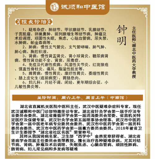 武汉诚顺和中医门诊部(诚顺和中医馆)建馆10余年,秉持“诚信为本,顺时养生,和谐健康”的中医文化精髓,坚持“名中医,好中药”的立馆之本,在中医药临床诊疗常见病、老慢病、疑难杂症及健康养生等领域颇具特色,建设和形成了老中青结合的李轩锦、钟明、徐长化、姜瑞雪、张林茂、王大宪、龚红卫、范平、宋跃进、王儒英、李家发、刘玉茂、高进、段正莉、刘义涛、陈德货、宋恩峰、李瀚旻、梅应兵、张振鄂、汪旭东、何友为、乐芹、曾凡鹏、向贤德、熊勇、廉河清、孔政、吴隆贵、胡爱玲、柳新樵、肖早梅、王垚、丁辛、鲁本堂、黎诗琪、蹇峰、让敏、张波茹、罗天禄、朱长江、陈丽娟、陈必新、周忠明、杨银锋(排名不分先后)等40余位名老中医团队,10余年坚持甄选道地药材,特邀湖北省多位七旬老药师亲手把控药材的进存和煎制,同时积极参与社会公益慈善活动,是武汉卫计委批准成立的正规中医医疗机构,是武汉市医保定点医疗机构,是国医大师路志正中医养生实践基地,广州中医药大学中医养生实践基地授权,屡获武汉市社工志愿者协会表彰。