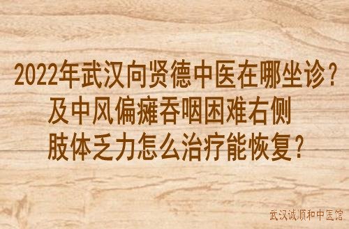 2022年武汉向贤德中医在哪坐诊?及中风偏瘫吞咽困难右侧肢体乏力怎么治疗能恢复?患者男,70岁,初诊诉中风偏瘫3月。病史:患者在3月前出现头晕,伴天旋地转感,恶心欲呕,口角向右歪斜,左眼睑下垂,第二天早晨出现呕吐及吞咽较困难,右侧肢体乏力,遂至某院住院治疗。住院期间予丁苯酞、依达拉奉等治疗及对症处理后症缓,唯右侧肢体乏力及吞咽较困难未见明显好转,遂慕名来门诊求治。